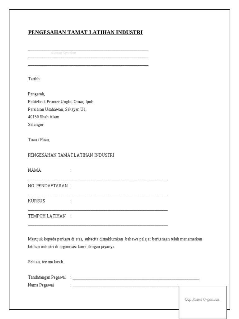 Contoh Surat Pengesahan Tamat Latihan Industri Pdf