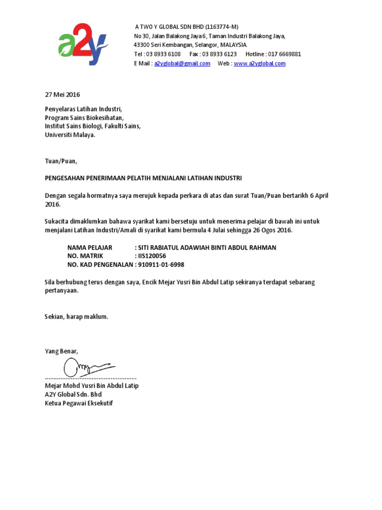 Merujuk kepada surat tawaran penempatan di firma tuanpuan bertarikh. Berikut dikongsikan contoh surat permohonan latihan industri. Nurul Syifaa binti.