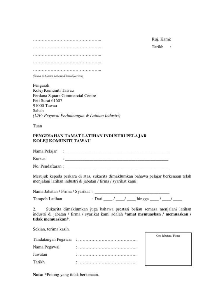 Surat rasmi latihan industri surasm. Surat permohonan pelajar latihan industri. Surat rayuan keputusan peperiksaan perlu dialamatkan kepada Unit Penilaian dan Peperiksaan Politeknik Ungku Omar Jalan Raja Musa Mahadi 31400 Ipoh Perak.